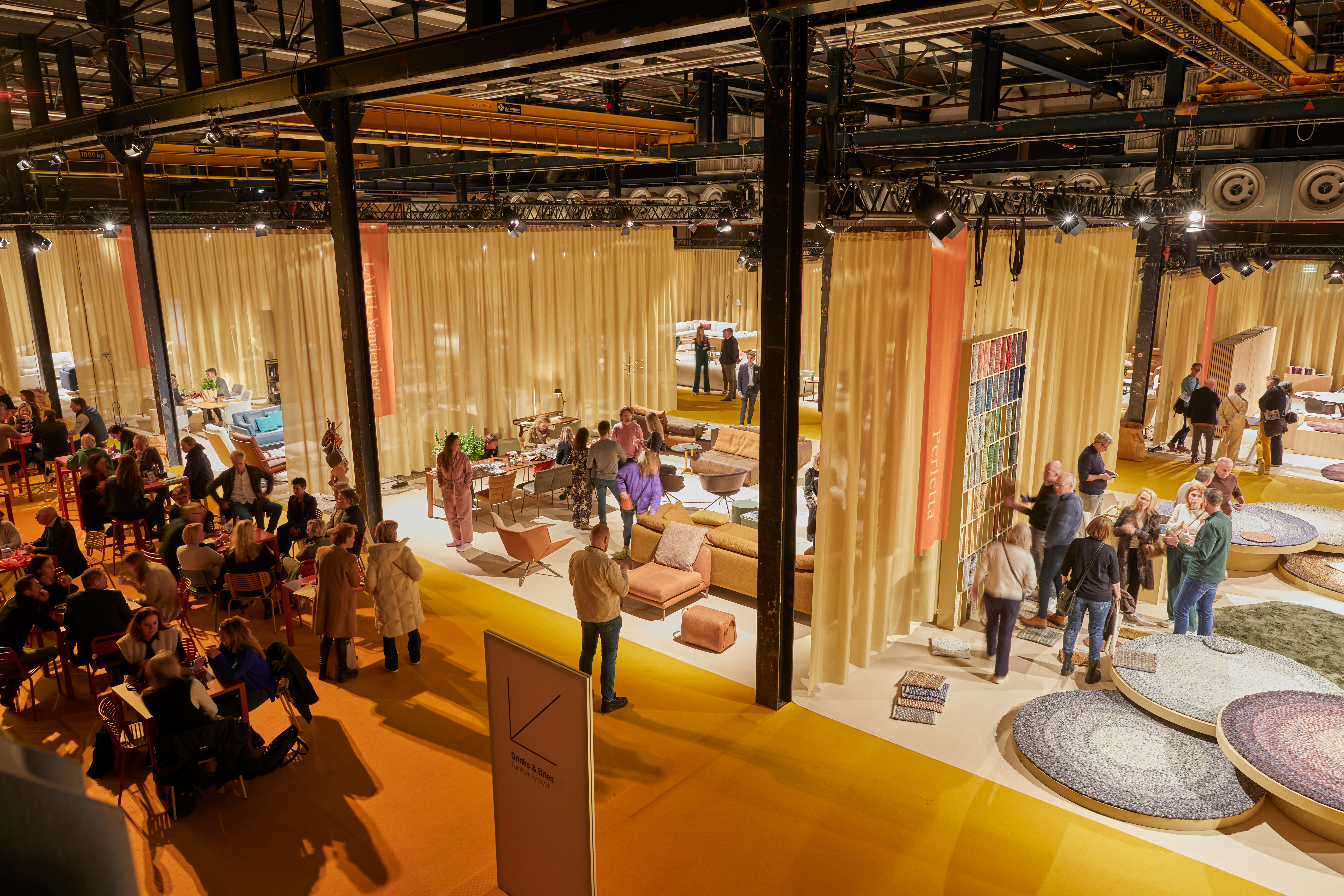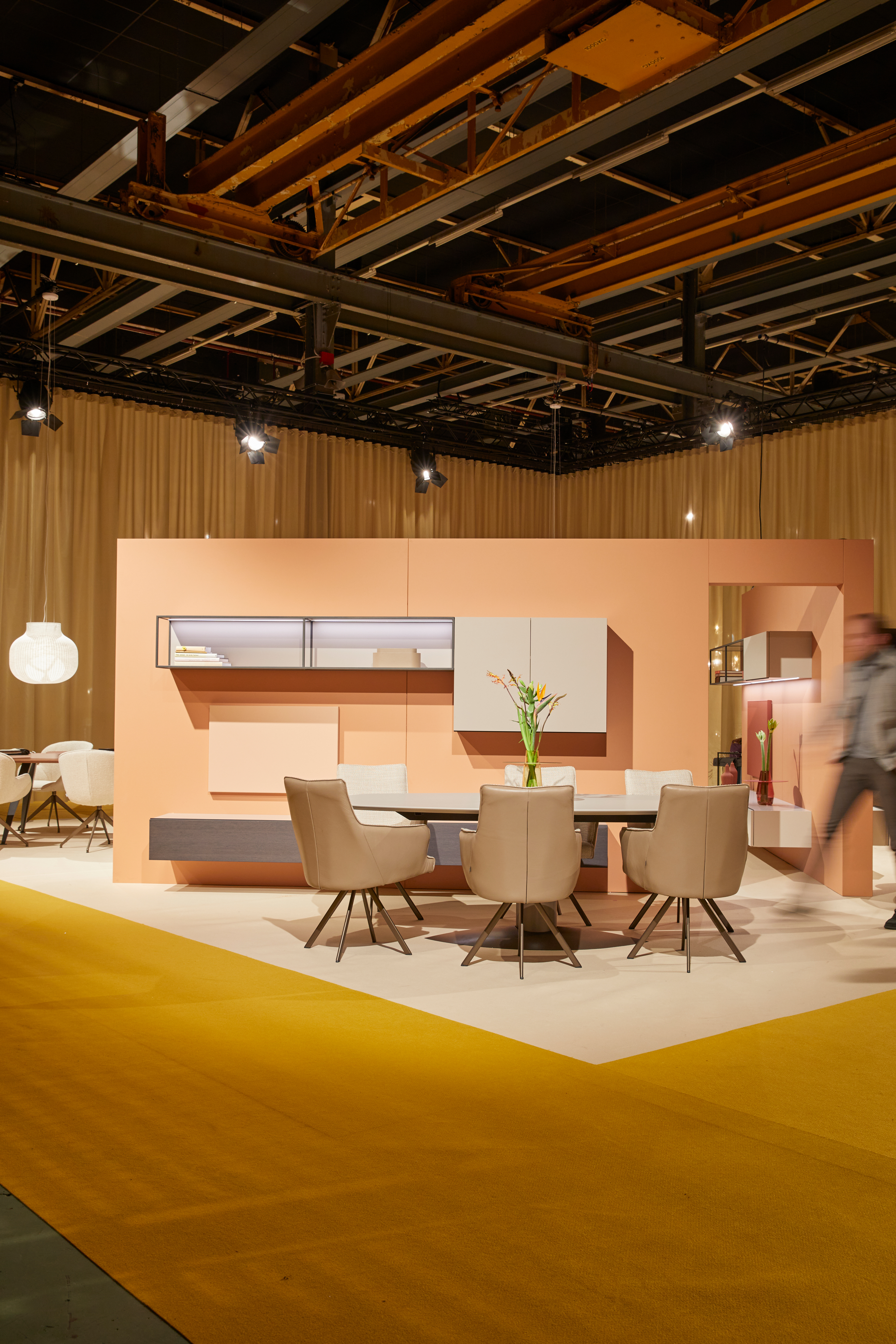 Trade fair designAs the year before, Studio Daphna Laurens is responsible for the spatial design, which ideally translates the cooperative focus: “We wanted to create a more open, transparent event, without blocking walls and with uniform surfaces for the manufacturers,” says Daphna Isaacs Burggraaf. All exhibition spaces are thus the same colour, just as the visuals of the respective logos are uniform. By doing so, they aim at creating a hybrid between an exhibition and a commercial business event. Curtains serve as room dividers – while last year they were dipped in powder pink and slate green, this time the duo chose yellowish golden and beige tones and contrasted them with brick red. “A lot of our work is intuition. We naturally wanted to create a positive mood for Destination: Design, but neutral enough for any brand to work with,” explains Laurens Manders.