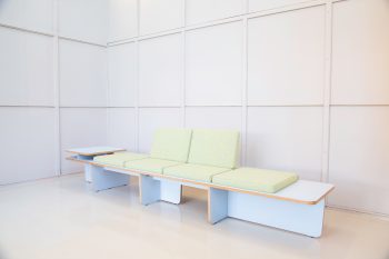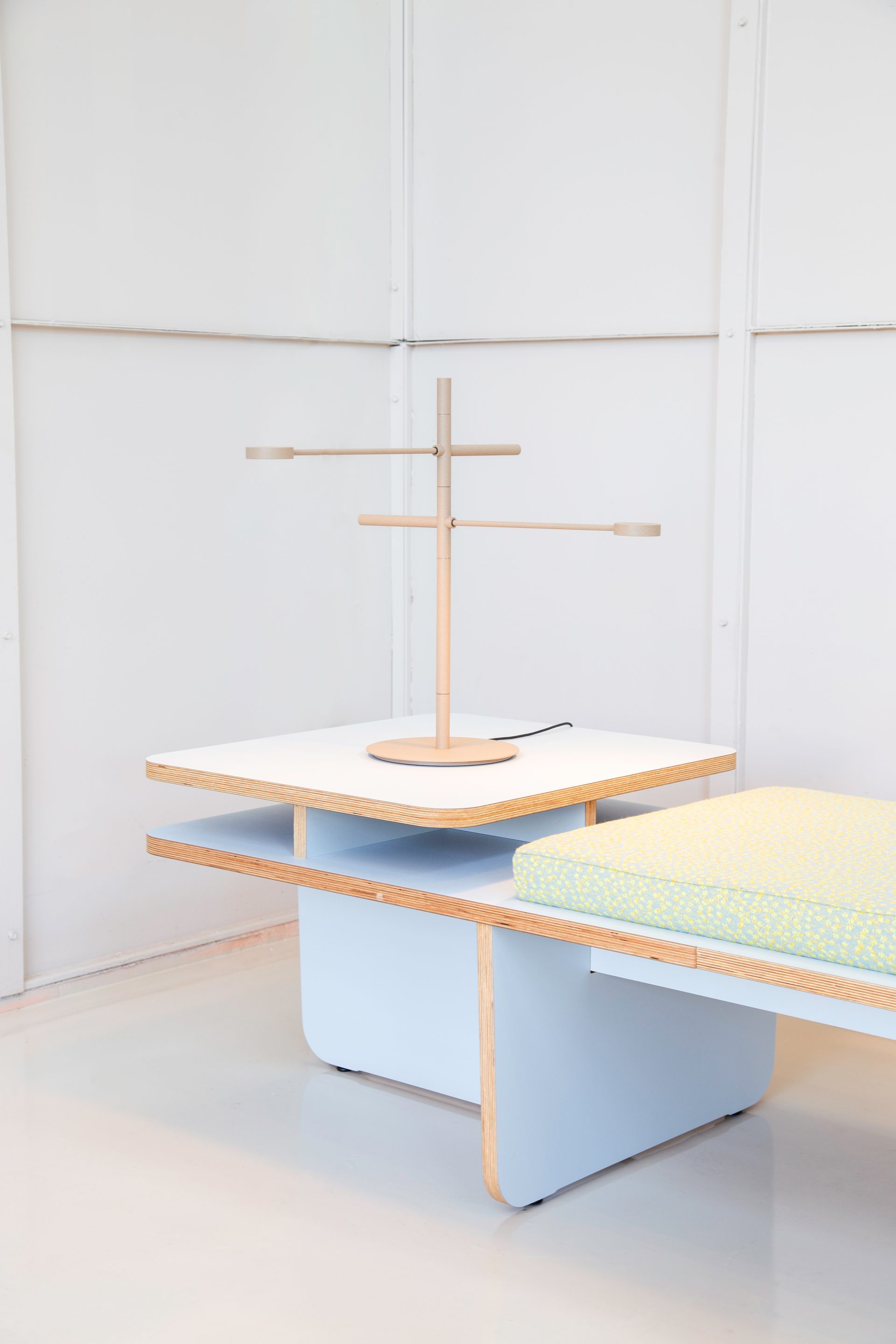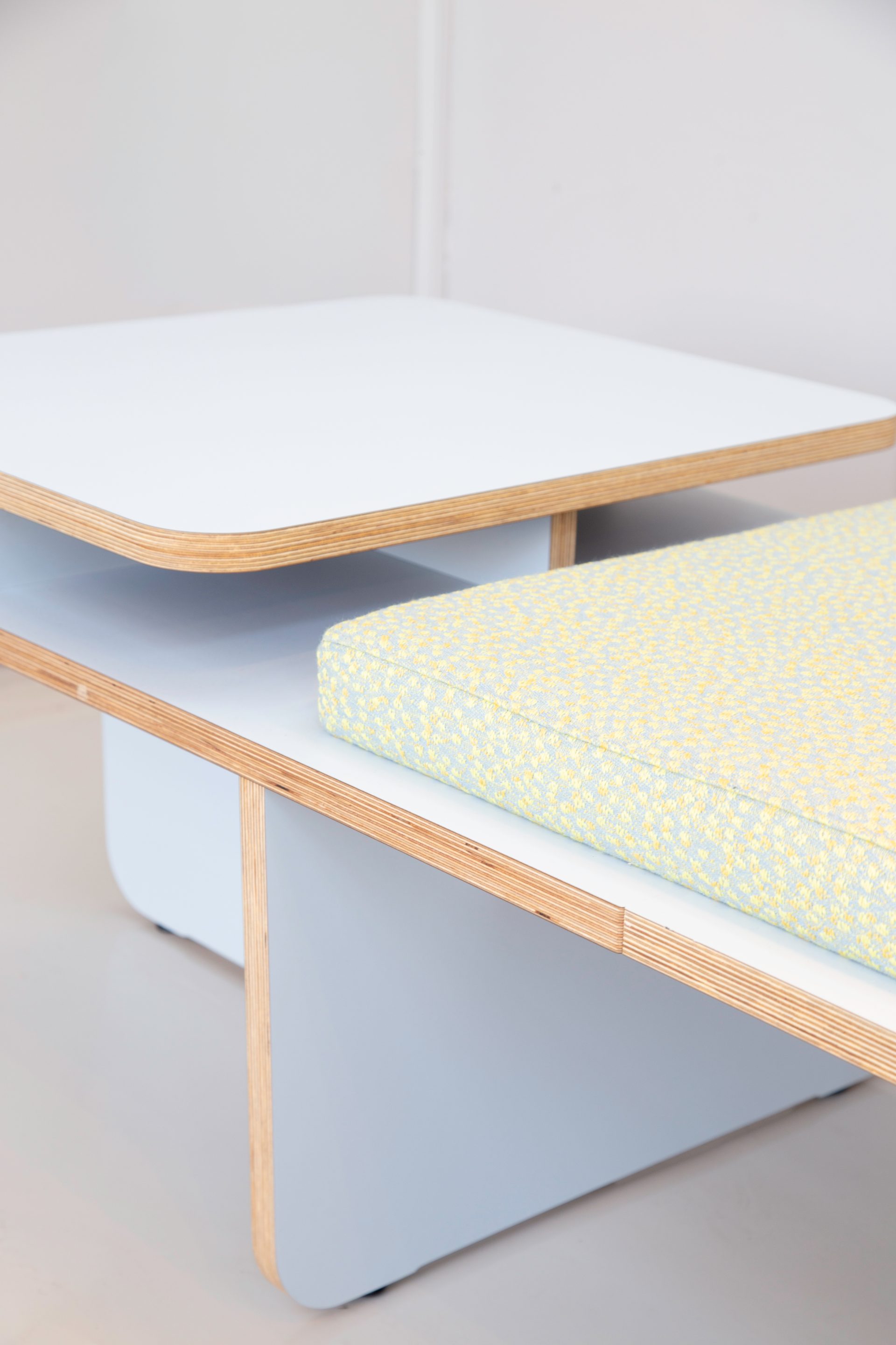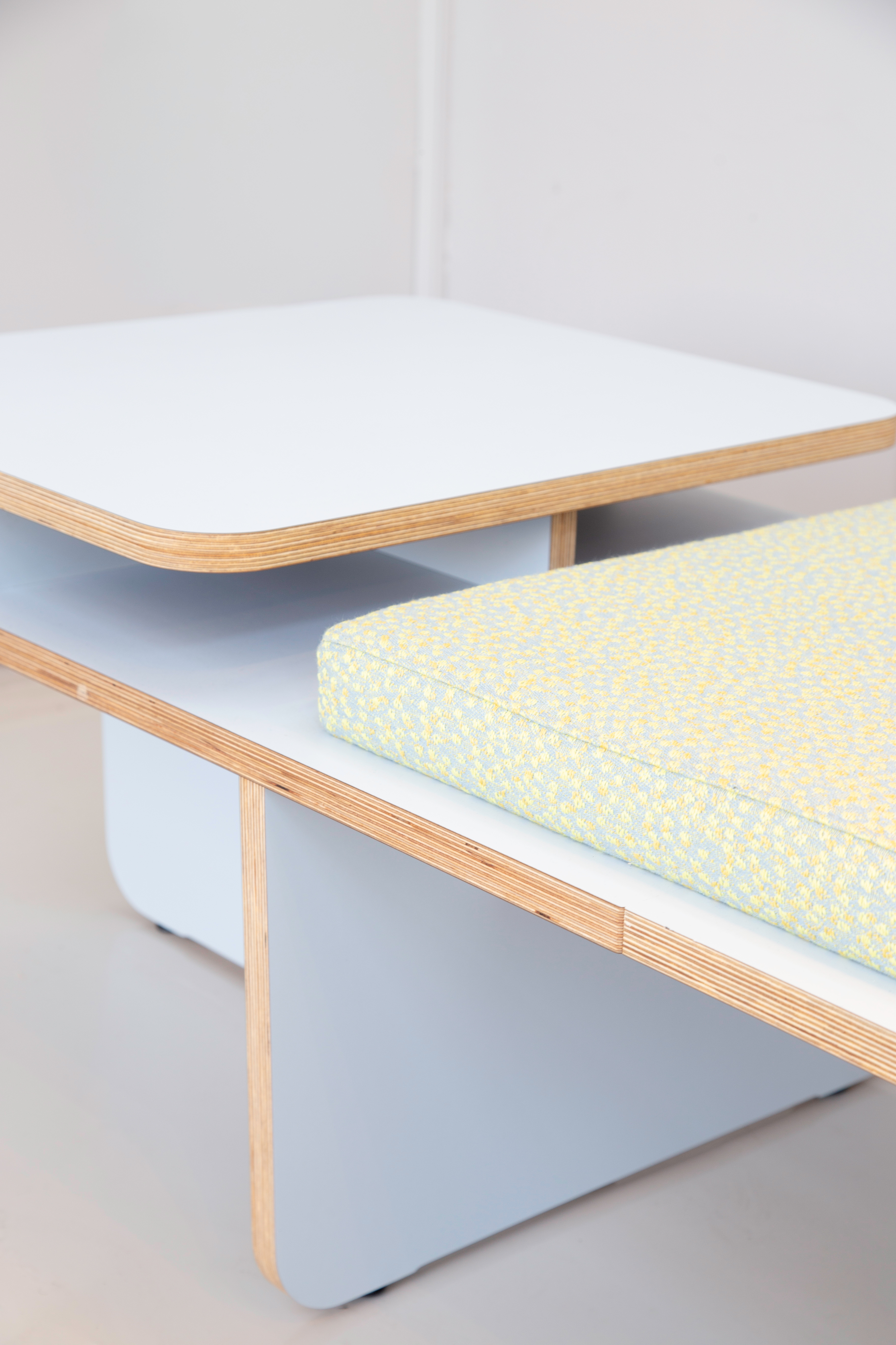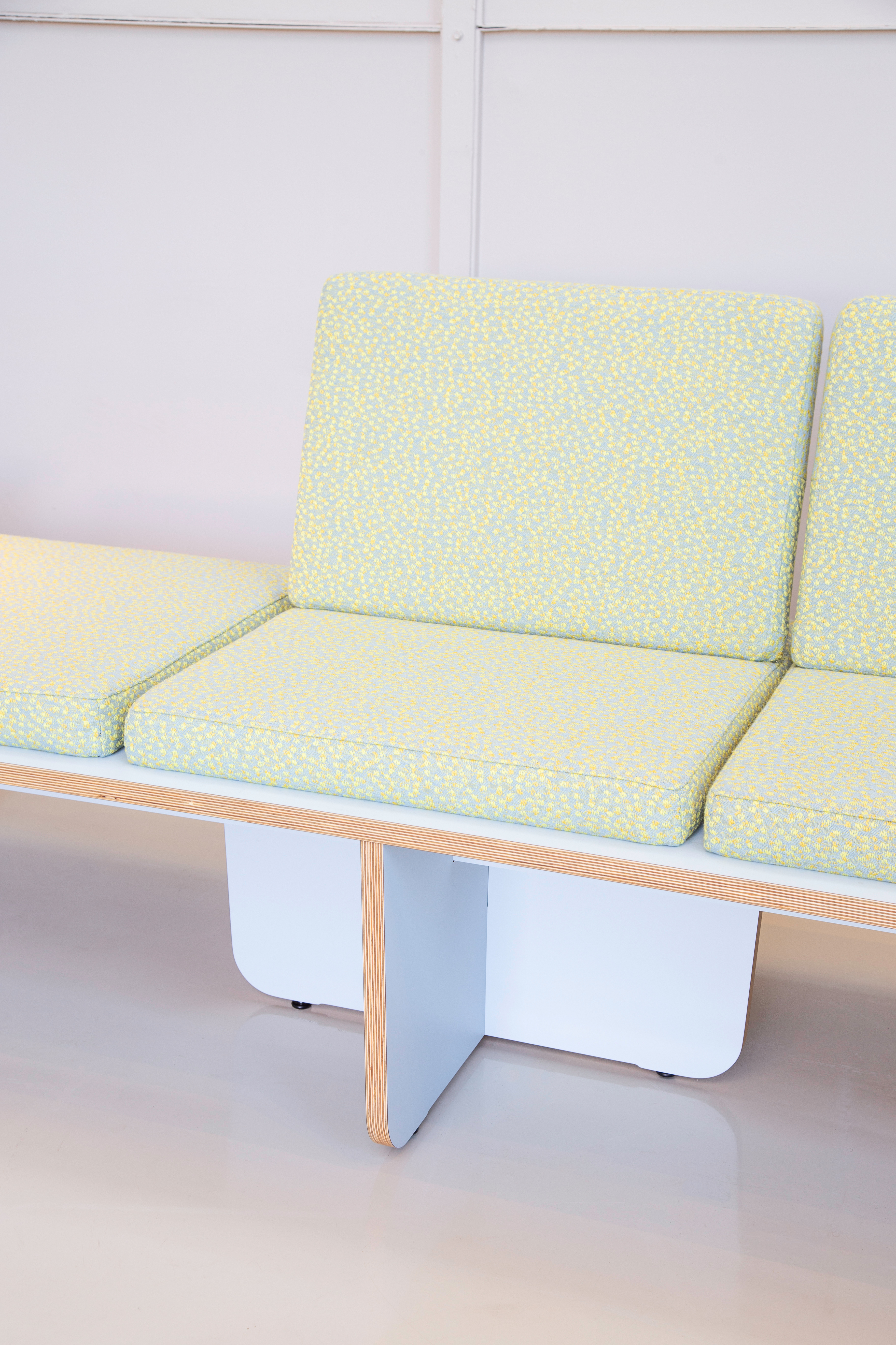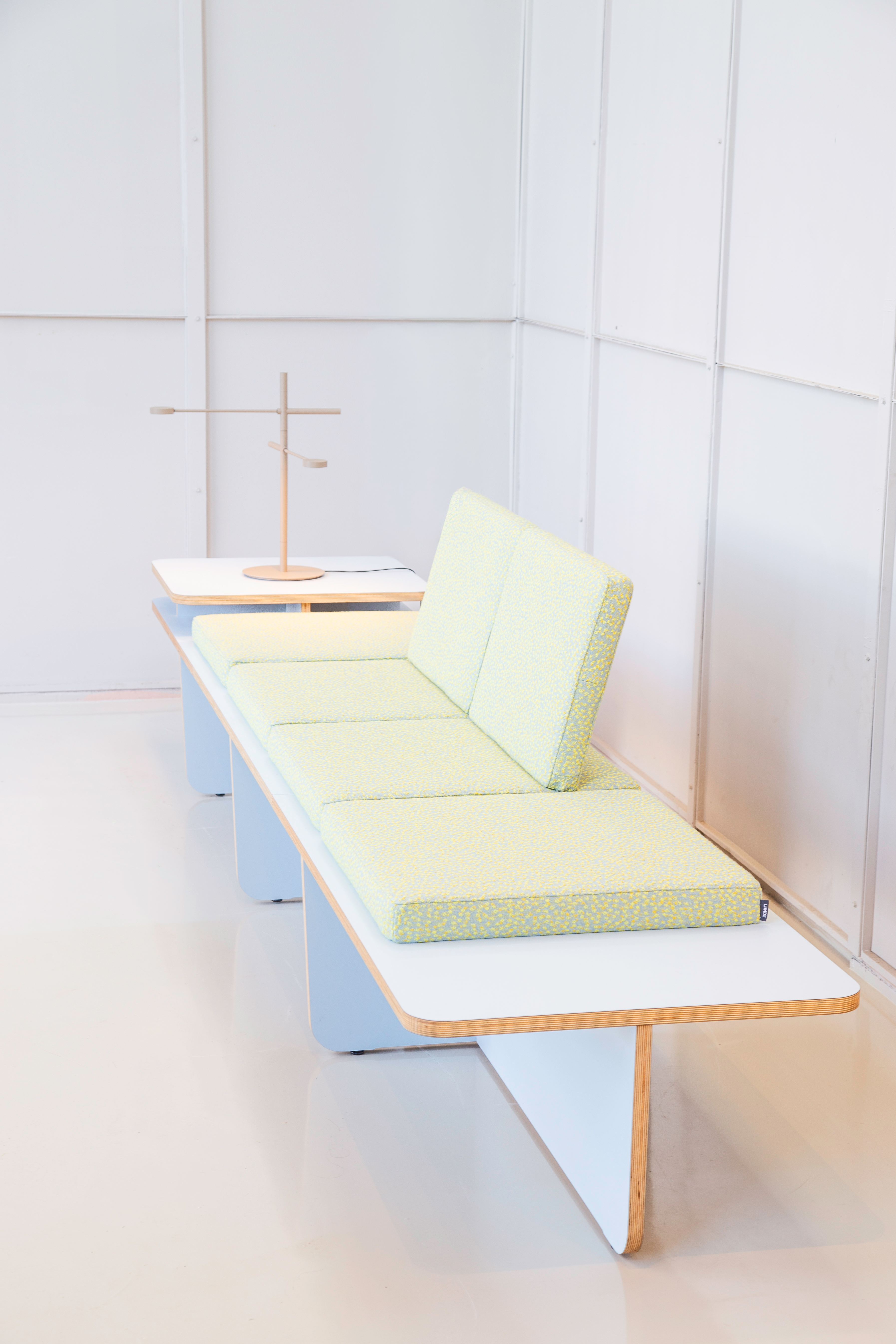 As a result of simultaneously exploring ‘the field’ we decided to embrace the ‘open plan’ architecture of present-day companies, buildings and spaces. So instead of creating a high-back sofa, that in our viewpoint, would not specifically be a well founded ‘addition’ to the segment of contract furniture we aimed at creating the opposite; a product that will not obstruct lines of sight in a space, by literally keeping things ‘flat’. On top of that we believe that the sofa system is more versatile when not to many functions, like room dividing, are being integrated into the product.