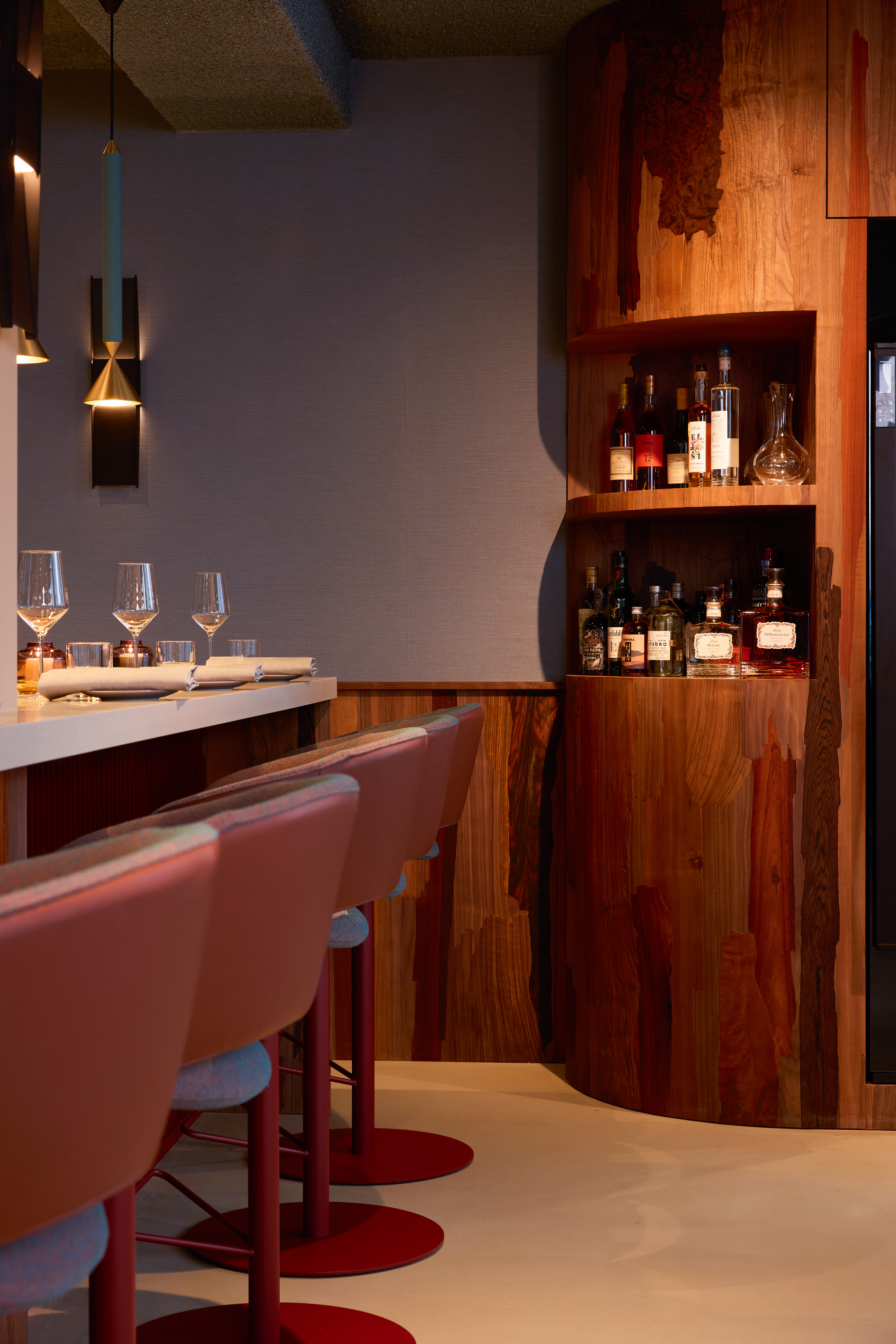 For Vondels Chefsbar, Jeroen Wand was responsible for the production of the entire interior. In close collaboration with Daphna Laurens, he translated the interior concept into built elements and custom details. His Re-veneer technique was applied to a series of bespoke interior pieces, including a custom wine cabinet and wall paneling, integrating material experimentation directly into the architectural framework of the space.